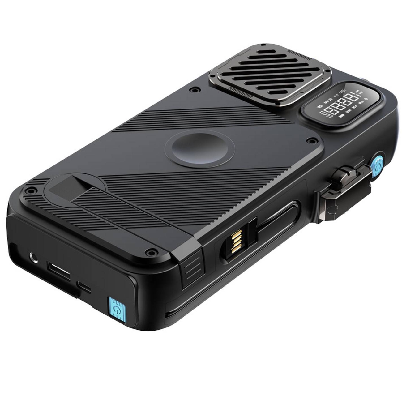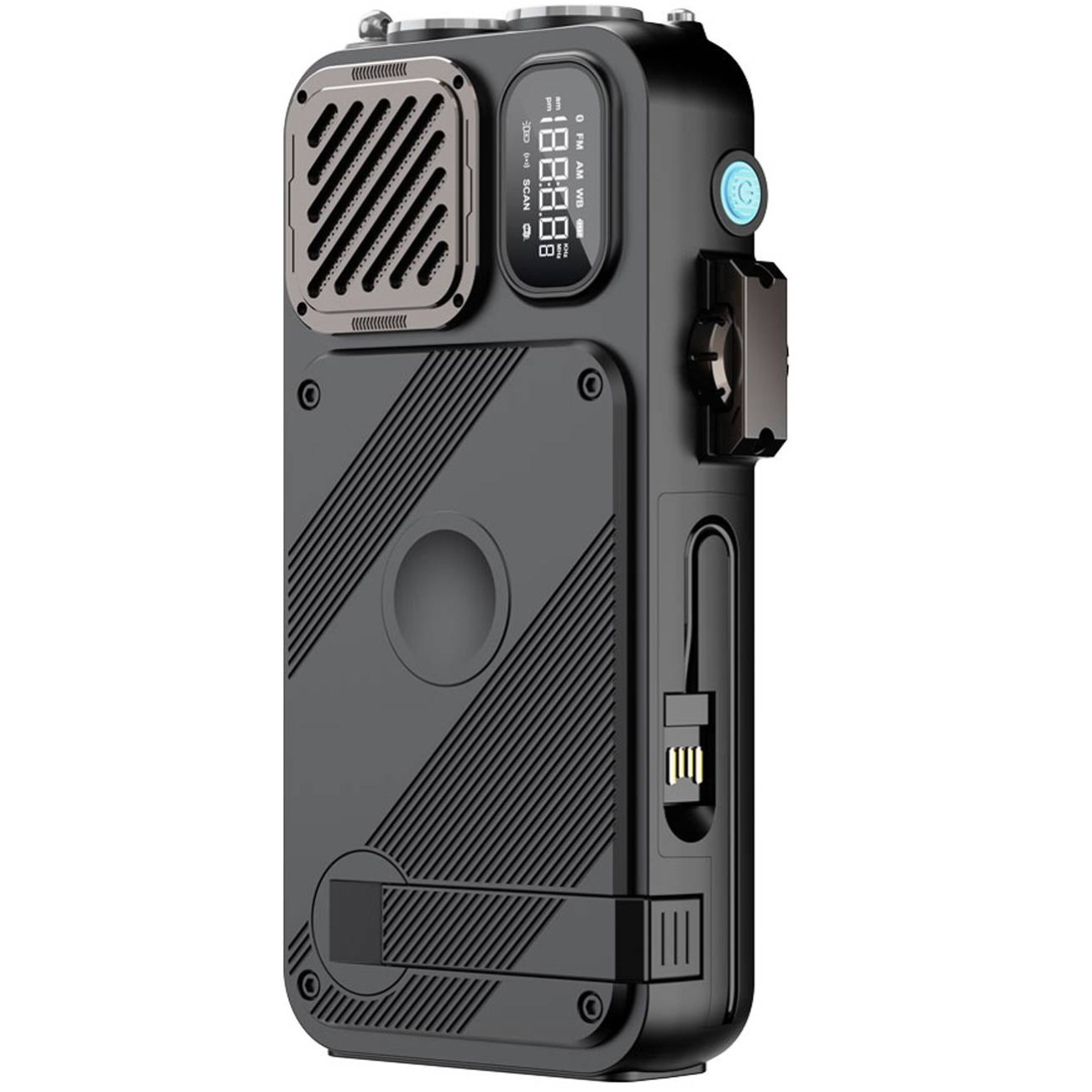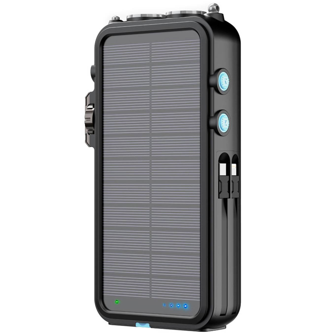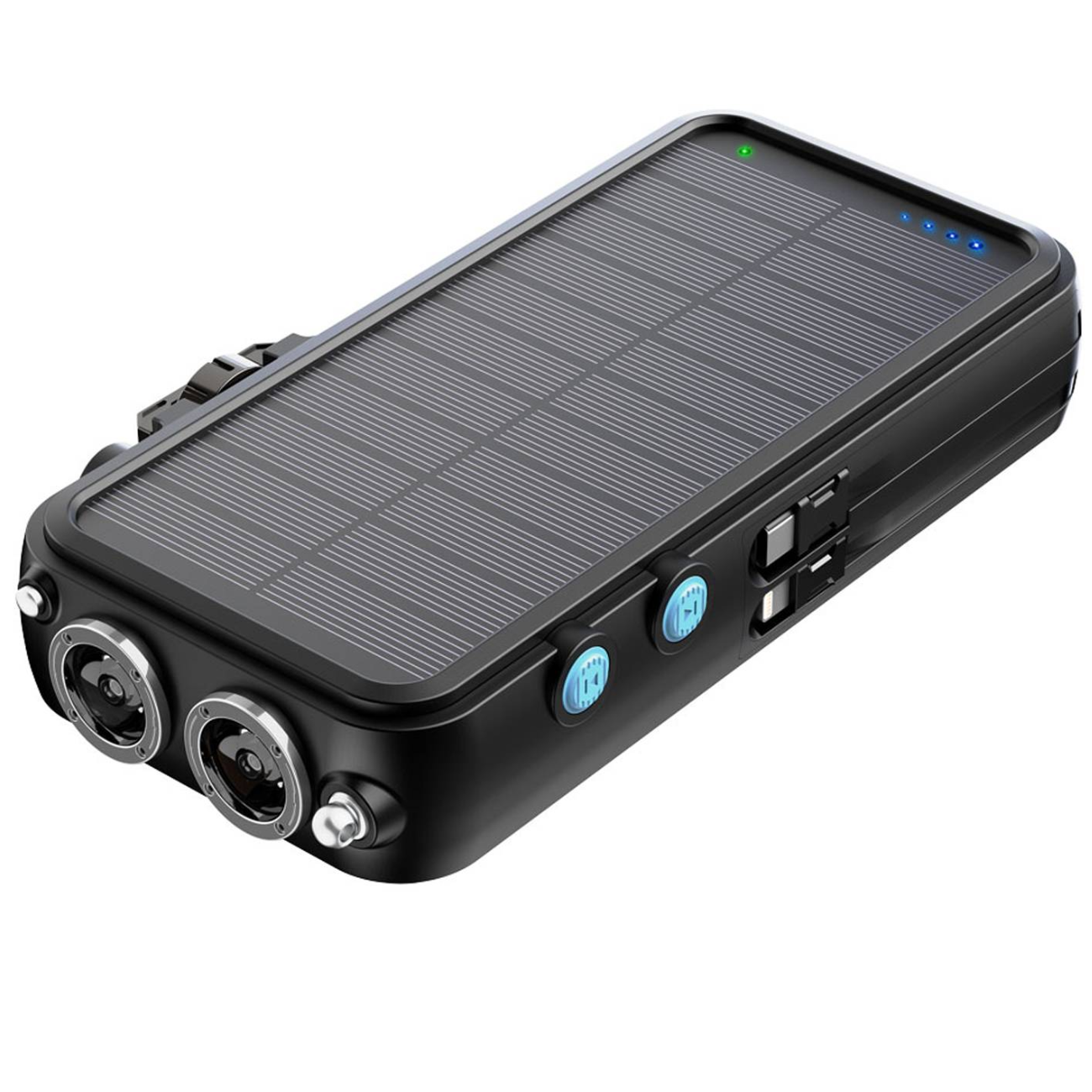 پنل خورشیدی، کابل تایپ سی و لایتنینگ متصل به بدنه، دارای چراغ قوه، اسپیکر بلوتوث، ساعت دیجیتالی، رادیو FM، شارژر وایرلس اپل واچ، دسته دینام دستی